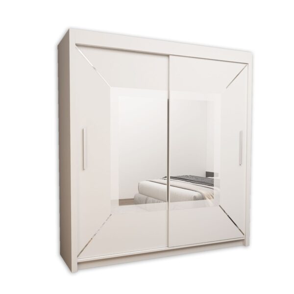 - Storage: 10 shelves, 4 hanging rails (with 2 optional shelves), 2 mirror sliding doors